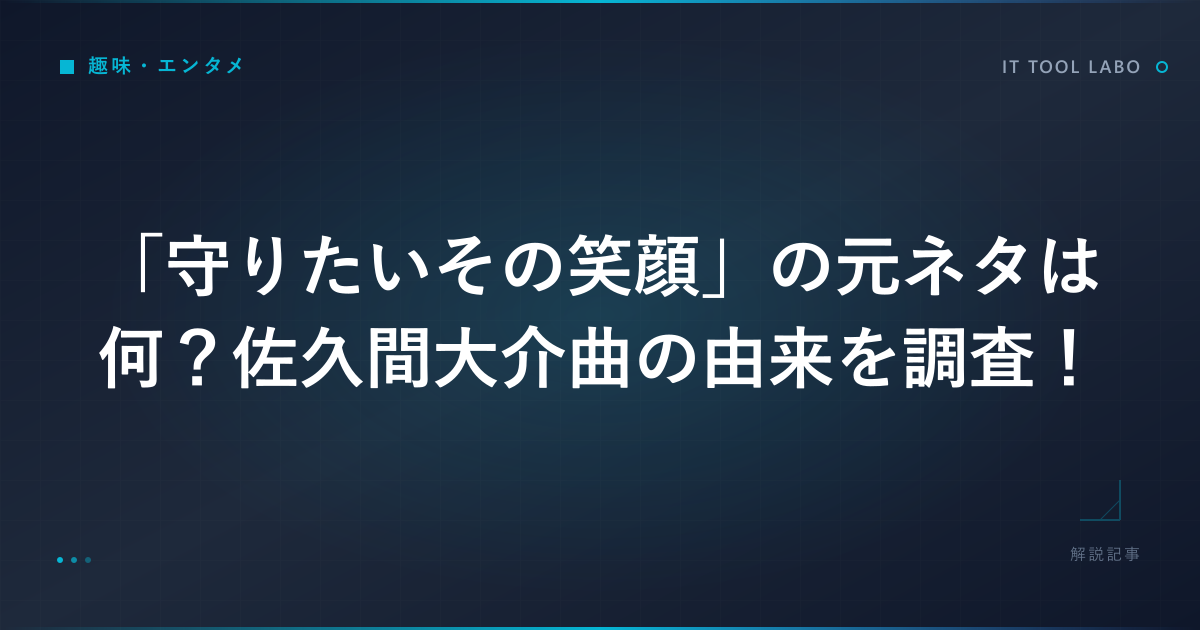 最後に、「守りたい、その笑顔」の元ネタと佐久間大介さんのソロ曲との関係を整理しておきます。元ネタはネットミーム「守りたい、この笑顔」で、2010年の『侵略!イカ娘』コメントや2006年の個人ブログなど、複数の起源が絡み合って広まりました。