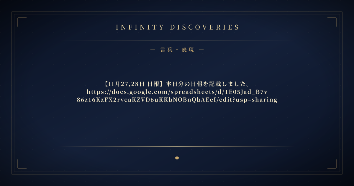 言葉・表現 PR 【11月27,28日 日報】本日分の日報を記載しました。https://docs.google.com/spreadsheets/d/1E05Jad_B7v86z16KzFX2rvcaKZVD6uKKbNOBnQbAEeI/edit?usp=sharing いんでぃす 2025年11月29日 / 2026年4月9日 記事内に商品プロモーションを含む場合があります 広告・スポンサーリンク よろしくお願いいたします! 広告・スポンサーリンク